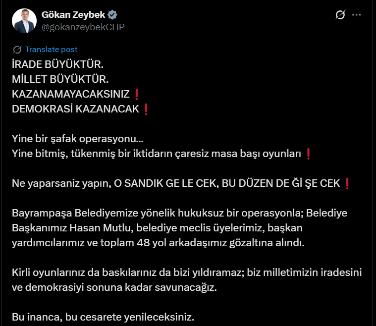 Bayrampaşa Belediyesi’ne yönelik sabah saatlerinde gerçekleştirilen operasyon siyasette tansiyonu yükseltti. Belediye Başkanı Hasan Mutlu, belediye meclis üyeleri, başkan yardımcıları ve toplam 48 kişinin gözaltına alındığı operasyon hakkında CHP Genel Başkan Yardımcısı Gökan Zeybek açıklama yaptı.