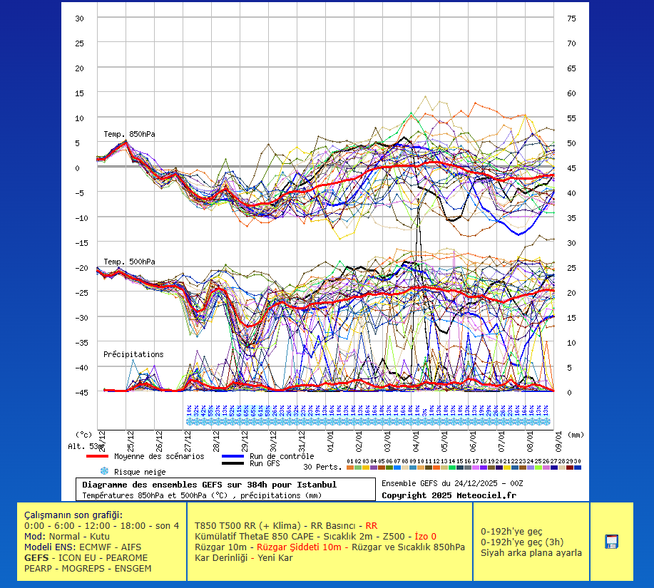 “30 Aralık-31 Aralık ve 1 Ocak’a sarkan günlerde Batı bölgelerinde kar yağışının mümkün olacağını görüyoruz. Bu kesin değil. Daha bir haftadan fazla var. Dolayısıyla yüzde 50’lik bir ihtimal vardı bu yüzde 60’a çıktı esasında. Marmara Bölgesi’ne poyrazdan gelecek hava, Sibirya üzerinden sarkacak bir soğuk hava var. Bu soğuk hava Marmara’nın tamamı, Batı Karadeniz, İç Anadolu Bölgesi’nde 30 Aralık-31 Aralık’ta yani yılbaşı gecesinde kar yağışı görülebilecek.